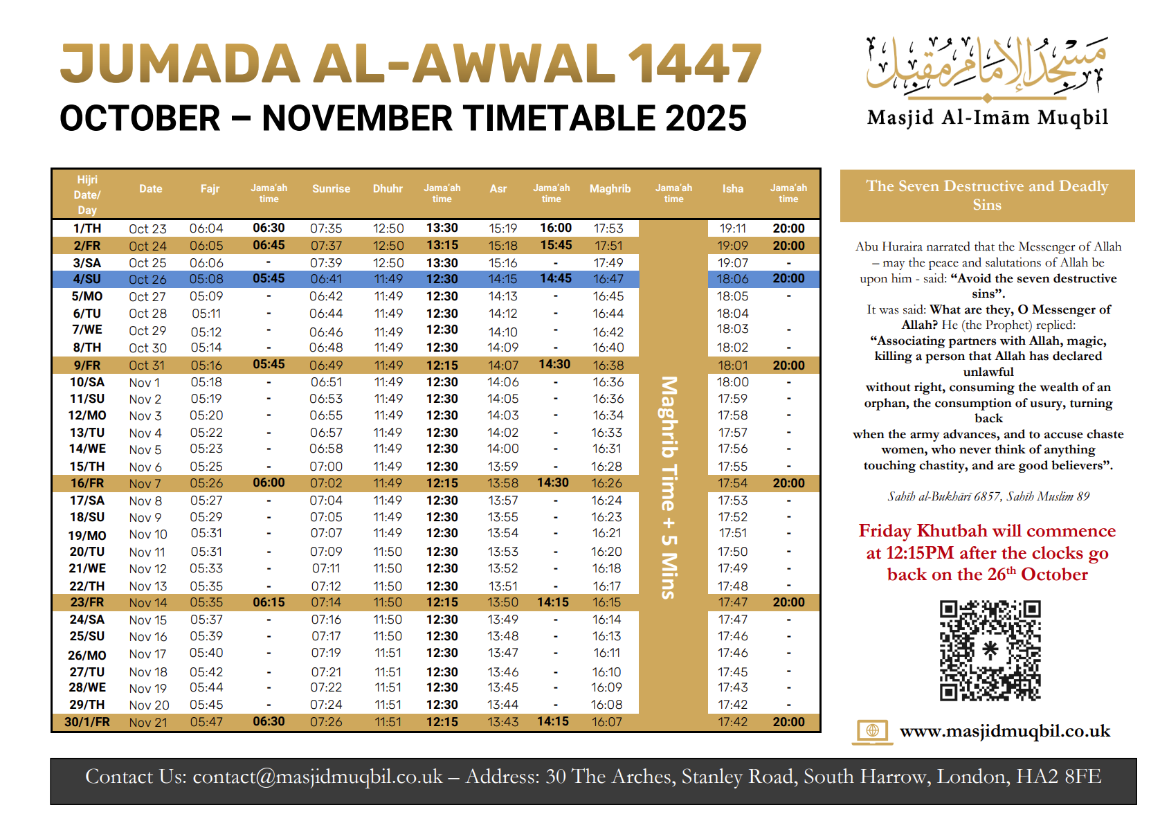 The prayer times listed in this timetable are provided as guidelines. The congregational prayer will commence once the Imām arrives, as per the prophetic instruction: